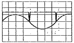 In practice, we used a dual-channel oscilloscope to compare the voltage across the Helmholtz coils and the voltage across the RF oscillator. In order for resonance to occur, the voltage across the RF oscillator should drop twice per cycle of the sinusoidally varying magnetic field (and the voltage across the Helmholtz coils). This is happens when the voltage across the RF oscillator changes when the voltage across the Helmholtz coils passes through the voltage about which it oscillates. See Figure 2 for an illustration of what the oscilloscope traces should look like for resonance.