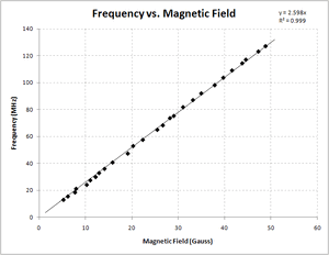 Wow, your data look awesome! Your figure looks great, and obviously very carefully taken data that look very linear. I agree with your remarks here, and I think the fact that the data look so linear and produce such a good fit gives strong clues to the possible sources of systematic error. It would seem that either your RF freq. measurement is biased by a fixed percentage, or your magnetic field is off by a fixed percentage. As you mention, either one of these is possible, though one would hope that the RF frequency divider was manufactured with better than 10% accuracy. So, the magnetic field would be a likely candidate. Unfortunately, we don't have a Gauss meter, though we should try to get one for next year. I'm not sure how much a single-axis hall probe would cost, but we do have an almost-homemade one that you could try to get working. Excellent work on this lab!