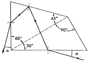 The apparatus we used was called a "constant deviation" spectrometer. As seen in fig. 2, we calibrated the spectrometer by moving the prism slightly to line up the right wavelength with its spectral line. To do this, we changed the adjustment dial, see fig. 3, to the wavelength noted to us in the lab manual and used the eye piece to view the right spectral color line. Then moving the prism slightly we aligned it exactly to the crosshairs in the eyepiece. The prism is set up and shaped to always have the light and incident light at 90 degrees as seen in fig. 1. The manual suggested we use mercury for the calibration, and gave us the exact wavelengths we needed for each colored line in the spectrum. This way we could calibrate the entire spectrometer. The lab manual gave us the wavelengths of each color to calibrate: