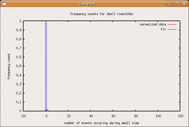 The plot that the script above produced with the data I obtained are shown in sequence below. As the dwell time increases, the most often occurring event count increases and the frequency vs. event count plots drift from something resembling a poisson distibution of a rarely occuring event to a the poisson distribution of a more common event, which resembles a gaussian.SJK 01:40, 22 October 2007 (CDT)