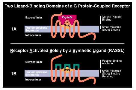 G protein signaling plays a crucial role in many physiologic processes that are best studied in vivo, such as cell proliferation, hormone secretion, neurotransmission, heart rate control, and smooth muscle contraction. Current studies of these physiologic processes are limited by the fact that we lack control over the effects of endogenous hormones and hormone receptors. To control receptor signaling we are engineering G protein-coupled receptors in an effort to make them respond exclusively to the drug (synthetic small molecule ligand), but not to the natural ligand. These receptors are designated RASSLs, an acronym for "Receptor Activated Solely by a Synthetic Ligand." We are particularly interested in using a RASSL to control hepatic and hematopoietic proliferation since we would like to induce a proliferative amplification of cells that have been genetically modified for the purposes of gene therapy, or tissue engineering.