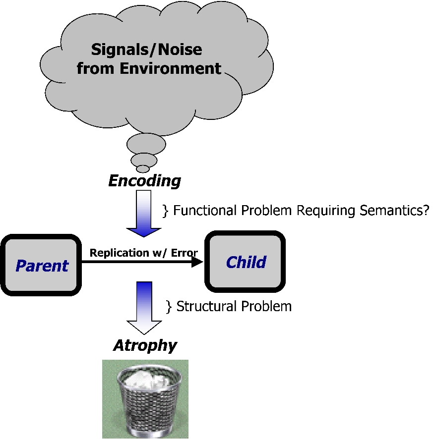- DE introduced problem from engineering perspective & provided naive mapping into information theory (i.e., parents = sender, offspring = receiver, machine design = message, replication process = channel, and so on).