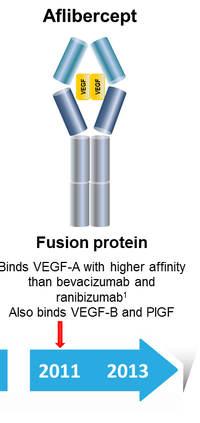 EYLEA first entered into clinical trials in 2001 for the purpose of treating cancer by acting as a vascular endothelial growth factor (VEGF) trap. The mechanism by which this worked was for the drug to bind circulating VEGF-a and -b and inhibit the growth of new blood vessel growth, which would essentially starve out tumors relying on progressive angiogenesis. In 2003, Aventis signed on with Regeneron to develop EYLEA in the field of cancer, and the drug found a specialization in treating proliferative eye diseases. One such disease, wet macular degeneration, causes blindness as abnormal blood vessels grow in the choriocapillaris leading to blood and protein leakage below the macula [3]. EYLEA functions as a recombinant fusion protein consisting of human derived VEGF binding domains that are fused to the human IgG1 immunoglobin, which allows it to preferentially bind circulating VEGF [3]. EYLEA earned approval from the FDA in 2011 for treatment of wet macular degeneration, but subsequently failed an important goal in Phase III trials for treating metastatic non-small cell lung cancer in March of the same year. In April of 2011, EYLEA entered Phase III trials for treatment of both metastatic colorectal cancer and metastatic prostate cancer. Following these trials, the FDA approved a recombinant version of aflibercept fused with 5-fluorouracil, marketed as ZALTRAP (ziv-aflibercept) for the treatment of metastatic colorectal cancer.