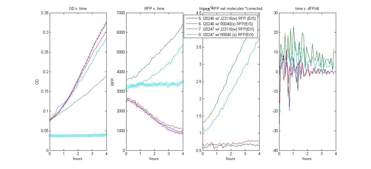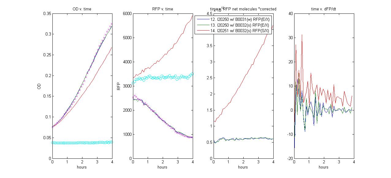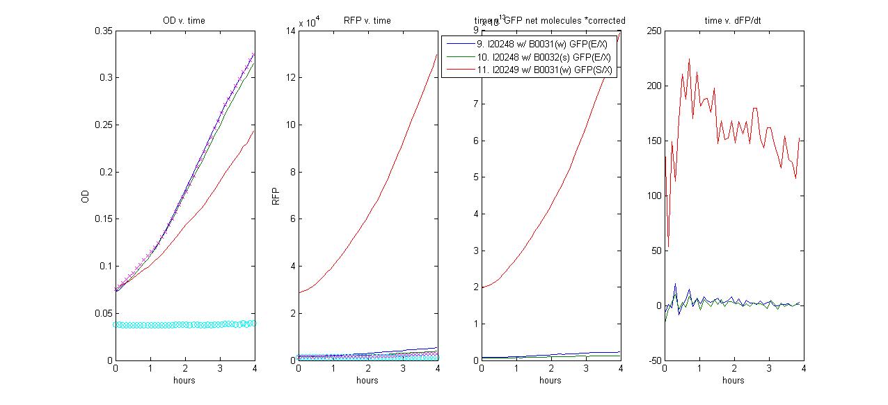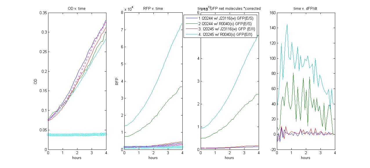 Results from 12/13. Included dFP/dt as a derived statistic representing the number of molecules of FP produced per cell per second. FP net molecules represents the total number of FP molecules in each well of the plate reader.