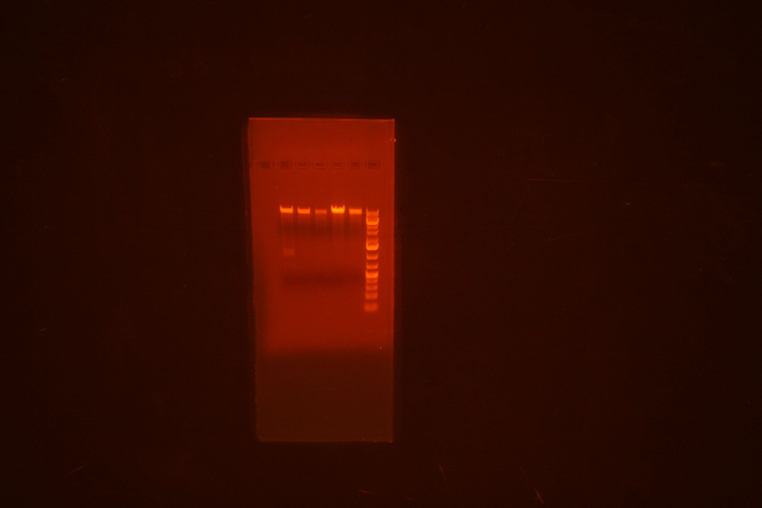The first 3 lanes are digestons from the first gel that I had some left over. The last 2 lanes are constructs 13 and 17 redone. For 11, I couldn't confirm the second band at 600 this time. It was probably due to contamination from 10 right next to it which is at 600 bp. Under the Treefort, I could see construct 17 very, very faintly. I continued to see nothing for 13. I then proceeded to do a colony PCR for 13 and got nothing. The gel is blank so it isn't interesting.