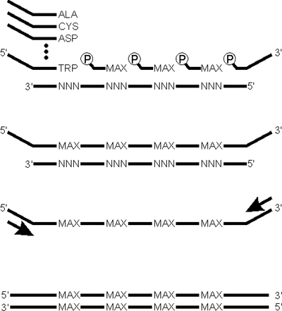 The appeal of a trinucleotide phosphoramidite based synthesis, or the type of split and mix strategy pursued by Lahr et al. [51], is the removal of codon bias and the ability to include codons for any subset of amino acids at a given position. A recently described oligonucleotide incorporation approach provides many of the same advantages while only requiring simple primers [72]. The MAX system described by Hine and co-workers relies on the annealing of specific oligonucleotides to select the specific subset of codons desired from a template that is completely randomised at the target codons (Figure 4). A template oligonucleotide is synthesised covering the region to be mutagenised, with each target codon completely randomised (NNN). Specific primers are then synthesised that cover the region 5’ to each target codon and terminate with each specific codon that is required for inclusion in the library. Thus if codons for all twenty amino acids are required then twenty ‘selection primers’, one with each codon, are synthesised. A set of primers is synthesised for each codon to be randomised. These primers are then annealed to the template and ligated. The selection primers will only ligate to the primer immediately 5’ when that primer is completely annealed to the template. The selection primers therefore select a subset from the 64 codons in the template. The ligated single strand containing the selection primers is then converted to dsDNA for incorporation into the full-length gene.