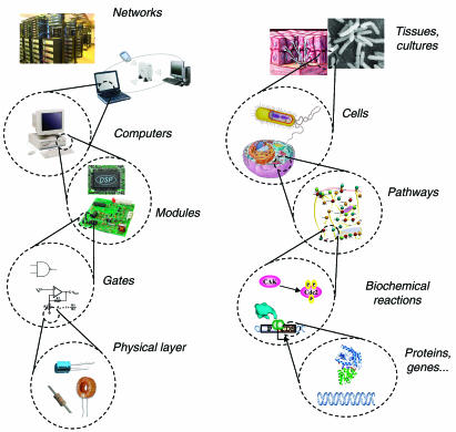 The goal of synthetic biology is to extend or modify the behavior of organisms and engineer them to perform new tasks. One useful analogy to conceptualize both the goal and methods of synthetic biology is the computer engineering hierarchy (Figure 1 ). Within the hierarchy, every constituent part is embedded in a more complex system that provides its context. Design of new behavior occurs with the top of the hierarchy in mind but is implemented bottom-up. At the bottom of the hierarchy are DNA, RNA, proteins, and metabolites (including lipids and carbohydrates, amino acids, and nucleotides), analogous to the physical layer of transistors, capacitors, and resistors in computer engineering. The next layer, the device layer, comprises biochemical reactions that regulate the flow of information and manipulate physical processes, equivalent to engineered logic gates that perform computations in a computer. At the module layer, the synthetic biologist uses a diverse library of biological devices to assemble complex pathways that function like integrated circuits. The connection of these modules to each other and their integration into host cells allows the synthetic biologist to extend or modify the behavior of cells in a programmatic fashion.
