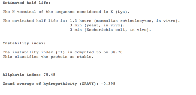 - ProtParam info showed many important qualities of the protein like molecular weight, aa composition, atomic composition, half-life, etc.