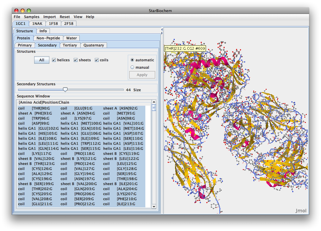 - These files can be opened with the Cn3D software site that is installed on the computers in the lab (this software is free, so you can download it and use it at home, too.)  Familiarize yourself with the software features (rendering and coloring) with both the gp120 peptide and ternary complex structures.  Alternately, you may choose to use the Star Biochem program to do this portion of your work.  Answer the following: