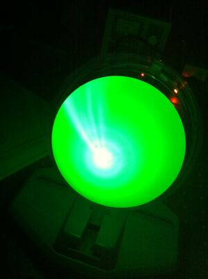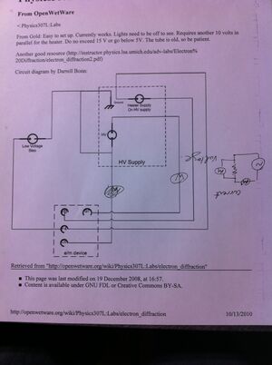- When we went into the dark room for our safety quiz, all the equipment was already set up for us. Prof. Koch then proceeded to disconnect everything, which meant we had to figure out how everything should be connected. Shortly after Koch left, Katie came to check on us and helped us connect everything according to the diagram found in Prof. Gold's Lab Manuual under the 'Electron Diffraction' Lab. (Steve Koch 21:42, 21 December 2010 (EST):Ha ha, well sorry! But it's part of the learning :) )