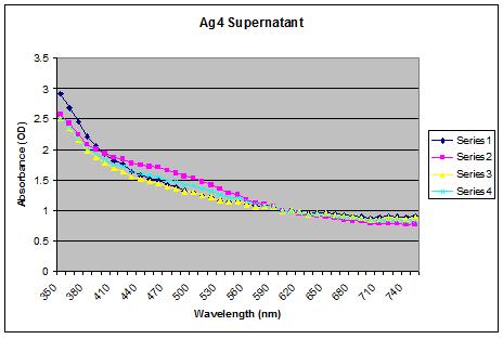 In order to get quantitative data, we need to find out which wavelengths are absorbed by the AG4 peptide silver precipitate. We chose a sample with good colour, and scanned it through the colour spectrum. The instrument used was the Tecan spectrophotometer, and measurements were taken. parameters: 250-800nm range. 10nm intervals. 96 well plate.