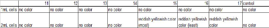 - (the lack of color from constructs 11-14 might be because of small volume since previous experiment had shown color.)