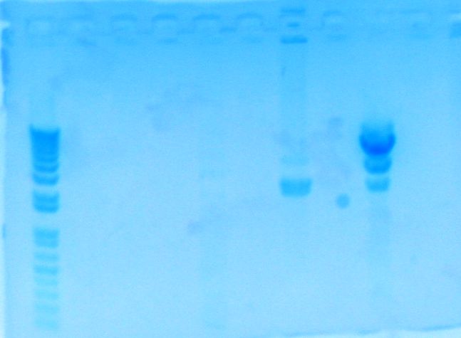 Lane 11 was mine. The fragment in that lane matched the 700-kb fragment on the DNA ladder lane. This indicates that I was able to take out the part from the MG1655 genome.