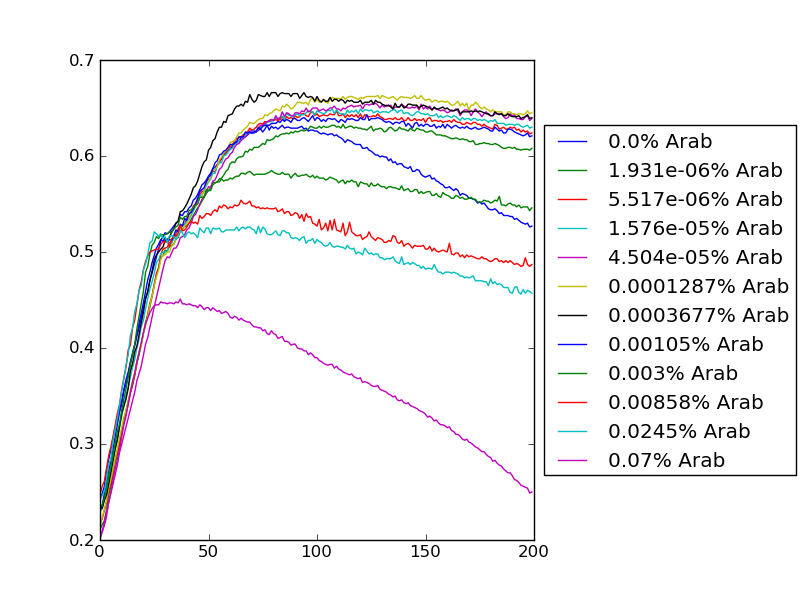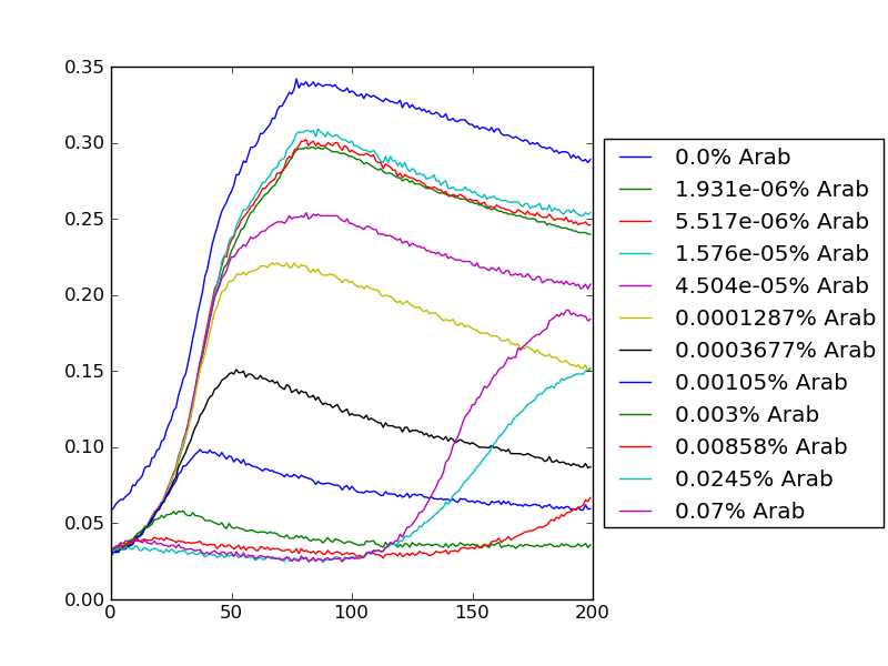 #use in python, make sure data file is there too #!/usr/bin/env python # encoding: utf-8 from scipy import linspace, polyval, polyfit, sqrt, stats, randn from matplotlib.mlab import * from scipy.optimize import curve_fit import numpy as np import matplotlib.pyplot as plt data = csv2rec('data.csv') conc = [0.0, 1.9309999999999998e-06, 5.5169999999999999e-06, 1.5760000000000002e-05, 4.5040000000000002e-05, 0.00012870000000000001, 0.00036769999999999999, 0.0010499999999999999, 0.0030000000000000001, 0.0085800000000000008, 0.024500000000000001, 0.070000000000000007, 0.20000000000000001] #t is in hours t = [num*6./60 for num in range(200)] satx = [] tox_growthrate = [] viol_growthrate = [] #prepare plots left = plt.subplot(1,2,1) tright = plt.subplot(2,2,2) bright = plt.subplot(2,2,4) for i in range(13)[::]: satx.append(conc[i]) toxy = np.array(data["tox"+str(i)]) violy = np.array(data["viol"+str(i)]) try: cony = np.array(data["con"+str(i)]) left.plot(t[0:100],np.log10(cony[0:100]), color='b', label=str(conc[i])) #plot for log OD con v. time except: pass left.plot(t[0:100],np.log10(toxy[0:100]), color='r', label=str(conc[i])) #plot for log OD toxR v. time left.plot(t[0:100],np.log10(violy[0:100]), color= 'g', label=str(conc[i])) #plot for log OD viol v. time left.set_ylabel("log(OD)") left.set_xlabel("time(h)") (tox_ar,tox_br)=polyfit(t[0:20],np.log10(toxy[0:20]),1) (viol_ar,viol_br)=polyfit(t[0:20],np.log10(violy[0:20]),1) tox_growthrate.append(tox_ar) viol_growthrate.append(viol_ar) #bright.plot(np.log10(satx), tox_growthrate, label = "ToxR") #plot for toxR grothrate v. [arab] #bright.plot(np.log10(satx), viol_growthrate, label = "Violacein") #plot for viola growthrate v. [arab] #bright.set_xlabel("log([Arabinose])") #bright.set_ylabel("growthrate(1/h)") tox_saturation = [data["tox%i"%(i)][100] for i in range(13)] viol_saturation = [data["viol%i"%(i)][100] for i in range(13)] con_saturation = [data["con%i"%(i)][100] for i in range(12)] #tright.plot(np.log10(satx), tox_saturation, label = 'ToxR') #plot for toxR sat od v. [arab] #tright.plot(np.log10(satx), viol_saturation, label = 'Viol') #plot for viol sat od v. [arab] #tright.plot(np.log10(satx)[:-1], con_saturation, label = 'Control') #plot for con sat od v. [arab] #tright.set_xlabel("log([Arabinose])") #tright.set_ylabel("OD at saturation") ax = left box = ax.get_position() box = ax.get_position() ax.set_position([box.x0, box.y0, box.width * 0.7, box.height]) ax.legend(loc='center left', bbox_to_anchor=(1, 0.5), title="%"+"Arabinose") #legend for left plot plt.suptitle("Violacein") plt.show()