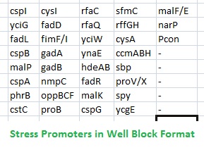 3. Picked control P_stress-GFP only colonies from frozen stock and grew in 2 mL of LB + KAN + SPEC each in 4 24 well blocks overnight