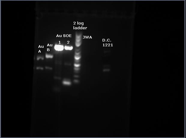 24uL ddH2O 3.3uL 10x Expand Buffer "2" 3.3uL dNTPs (2mM in each) 1uL Oligo ca998, 10uM 1uL Oligo g00101, 10uM 0.5uL Expand polymerase "1" 0.5uL Template DNA (A, diluted) 0.5uL Template DNA (B, diluted) ***in practice, tube was labeled on top as "Au SOE" and on side as "AuD SOE 2/21/12"