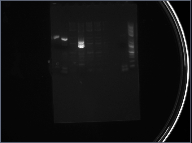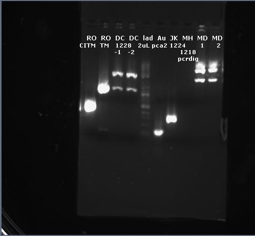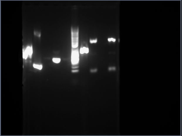1) Run PCR products on gel (10uL of PCR product +3uL of loading dye, 6uL of ladder) picture of gel (mine are the two left most wells)