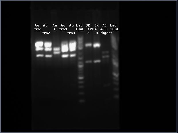 For tra1, tra2, tra3 7uL ddH2O 1uL Miniprepped plasmid 1uL 10x NEB Buffer 2 .5uL EcoRI .5uL BamHI