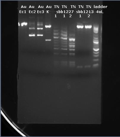 I have 3 bands, but that's explainable with partial digestion of the plasmids. The important part is that my plasmids look different from the control. What's also interesting to note is the lowest band looks like it could plausibly be 1.4kb, my expected size for the part (and SOE-PCR product) that I never go when I was doing the SOE-PCR (I kept getting something that looked ~3kb).