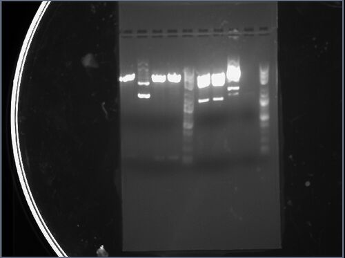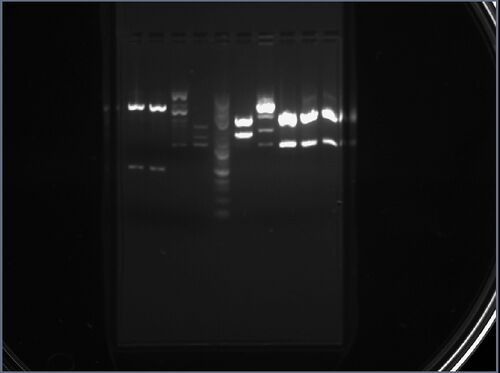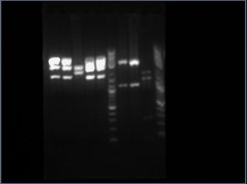 I performed this gel because I was not sure if the gel from March 6 for the first colony was correctly done, and also I wanted to try it out with different restriction enzymes. My sample of the same colony (colony 1) was added to the eighth lane from the left. It still seems to have four distinct bands, and I am thus not going to use that colony.