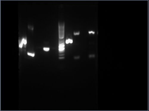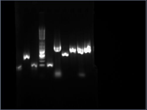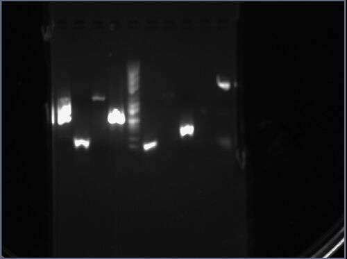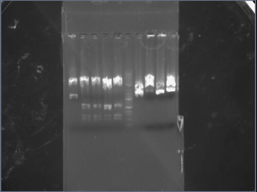 My gel is the seventh lane from the left. Per Professor Anderson, there may have been some overloading of the dye, which could explain the runs on the side of the lanes. The ladder was placed in the fourth lane from the left. Based on this image, the product of the PCA amplification process seems to be around 500bp, when the expected product was 396bp long.