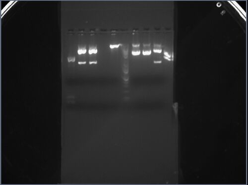 My two samples (from colonies 1 and 2) were added to the seventh and eighth lane from the left. The first sample (seventh lane) seems to have four distinct bands: this is a sign of either contamination by the parent vector or an incomplete digestion. The bottom band could also be due to overflow from the adjacent lane. I am going to retry this sample later with different restriction enzymes. The second sample (eighth lane) has two distinct bands: the first band corresponds to an approximate length of 1.2kbp, while the second band corresponds to an approximate length of 3kbp, which approximately match the expected lengths of 986bp and 2634bp.