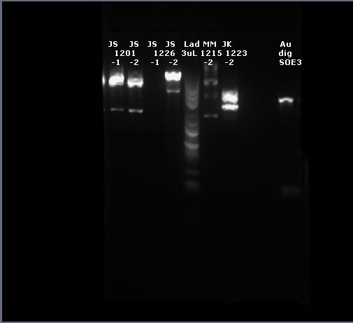 - Because there are so many bands present, it is likely that there were digestion problems that occurred, producing unexpected bands. These unexpected bands are most likely the larger bands. When looking at the smaller bands and comparing their sizes to the sizes on the ladder, the sizes still seem too large to be 2598 bp and 1022 bp; however, we think that there have been problems going on with the ladder. Thus, I compared my bands to the expected sizes of the other peoples' bands that were run on this gel. Au dig SOE3 should be 1.4 kb, JK should be 1.4 kb and 2.5 kb, JS 1201 should be 1092 bp and 627 bp and JS 1226 should be 1408 bp and 1640 bp. Thus, it is likely that my two smallest bands shown on the gel could be ~2.5 kb and ~1.0 kb as expected. The largest band is most likely genomic DNA.