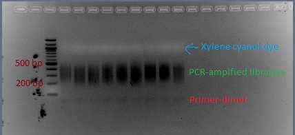 - If there is primer-dimer visible, run the remaining 45 μL of PCR product on a 2% agarose gel and extract the library (as was done pre-PCR). Follow the instructions in the Qiagen gel extraction kit as specified for sequencing. (After binding DNA to the column, do a wash with QG. When rinsing with PE, let sit for 2-5 minutes before spinning.) Typically I get primer-dimer, so I just do this extraction and skip the previous gel to test for primer-dimer.