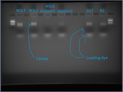 - Run your ~60 μL of library plus loading dye on the gel. The lane with the library should have a lane of 100 bp ladder on either side of it. You can put multiple libraries on one gel, but leave several empty lanes between them.