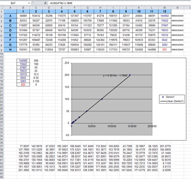 - Make a scatterplot of fluorescence intensity of the standard vs. the standard concentration. Given that the samples were diluted 2000X, the standard concentration is multiplied by 200: