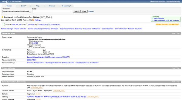 - This is the first portion of the assignment where we begin by searching for a particular entry in this case was dUTPase ecoli: and then we see the different options that it gives and this is how it looks: