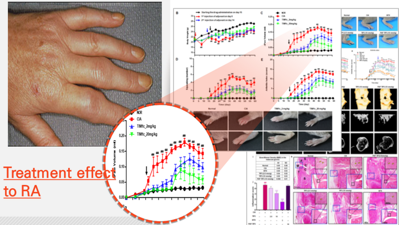 Reduction of RA indicators in the animal model and confirmation of the effect in tissue and joint recovery.