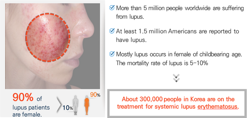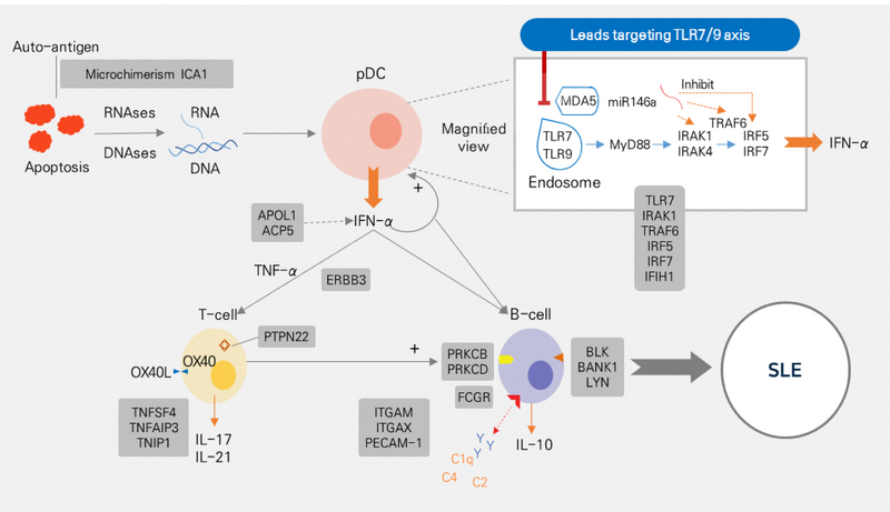 The TLR (Toll-like receptor) is one of the major factors in the pathogenesis of lupus. TLR signaling pathway plays a crucial role in the activation of innate immune responses, which is the first line of defense against external/foreign substances. TLR immediately responds to the invading pathogenic substances and secretes various cytokines to help the development of acquired immunity. However, if TLR signaling is over-activated, it can cause autoimmune or inflammatory diseases such as systemic lupus erythematosus or rheumatoid arthritis, which can be treated by directly blocking the signal transduction of the TLR.