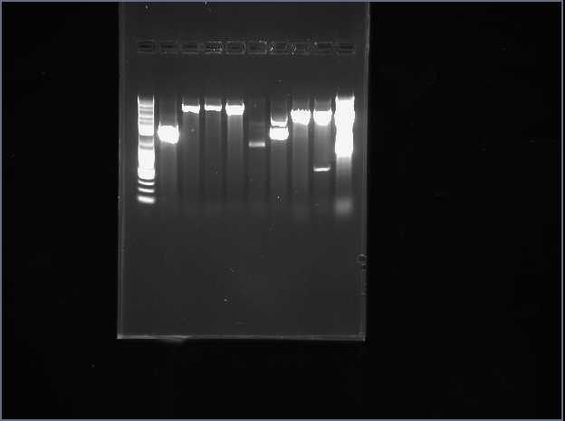 Map: Lane 1: ladder, lane 2: Glu1 1 (3.2,2.3), lane 3: Glu1 2 (3.2,2.3), lane 4: Glu1 3 (3.2,2.3), lane 5: Glu1 4 (3.2,2.3), lane 6: Ile (4.4,2.2) lane 7: Cys (3.2,1.7,.6), lane 8: Phe (4,3.3), lane 9: Gly (4,2.9), lane 10: Vector (4,1.3)