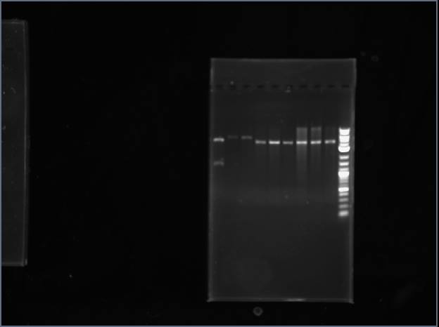 All three wells worked! Cut out the band with the longer DNA and placed in tube with 600uL ADB buffer. Melted, then frozen.