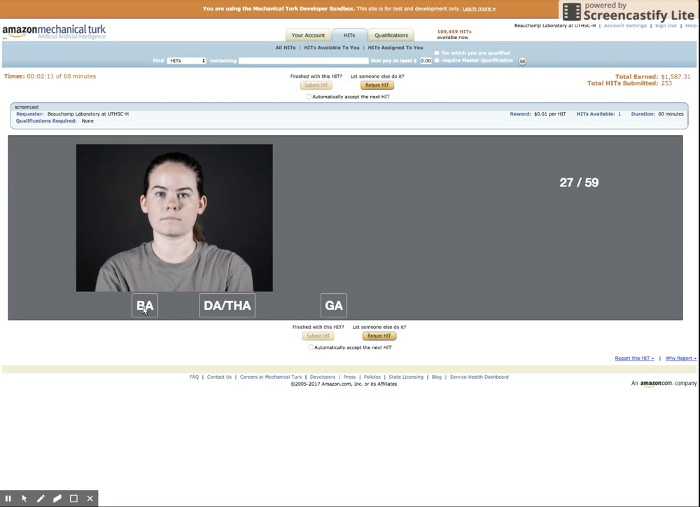 This experiment tested the effect of repetition without coarticulation on McGurk perception. Data were gathered using Amazon Mechanical Turk. An example of the what the user viewed may be seen in the link below. Each participant viewed a total of 11 different stimuli (including congruent stimuli and McGurk stimuli at 1x, 2x, 3x, and 6x repetitions), as seen by clicking on the below image. There was no significant difference in McGurk perception at different repetition levels.