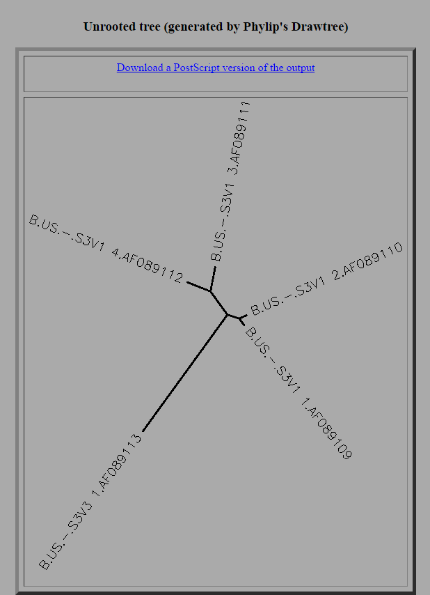 - The sequences were then analyzed by comparing the difference in the sequences along side the topology of the unrooted tree diagram and the pairwise similarity scores. Based upon the difference in the amino acid sequences the tree below was generated to show the similarities between the sequences. Thus, the sequences that have the most distance between them are S3V1_3 and S3V3_1, which means they are the most different sequences and have the most differences in terms of nucleotide bases. Furthermore, all differences and similarities can be see on the unrooted tree chart but one the noticeable characteristic was the similarity between S3V1_2 and S3V1_1, which happens to be the two most closely related sequences in the group. Additionally, the pairwise similarity scores also support the information characterized by the unrooted tree diagram. The difference between S3V1_3 and S3V3_1 is noted by having the lowest similarity score of any of the sequences at 95 while the difference between S3V1_2 and S3V1_1 is resulted in the highest similarity score, 99.