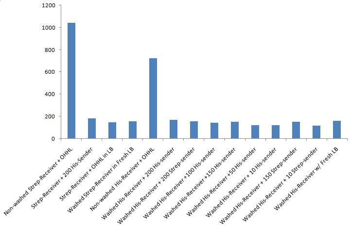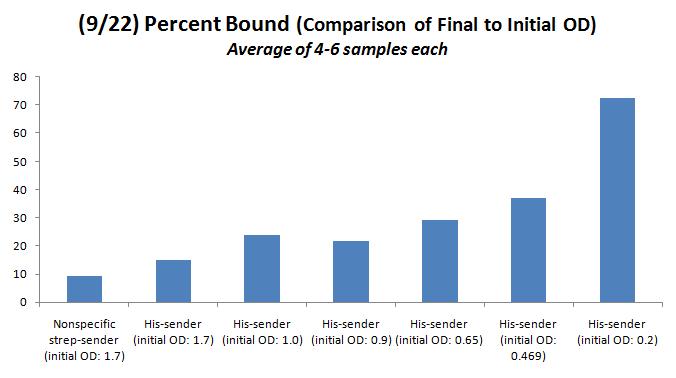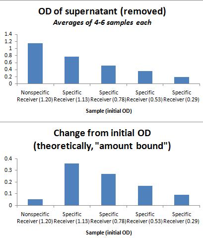 As shown in the graph below, the addition of equal ODs of His-sender (specific) and Strep-sender (nonspecific) results in a greater final OD left on the Nickel-plate for the specifically-bound senders.