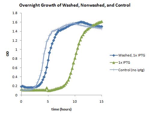 More plate reader - exploring washing after IPTG induction, detecting growth of fluorescence.
