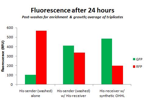 It's also worth noting that the cells were not washed after receiver was added, so I don't know how well the receivers are binding. I guess I want to make sure I get enrichment (almost NO strep ... or detectable difference in fluorescence growth curves, not available for this experiment) before I move onto that. That's the next step: bind senders, wash, bind receivers, wash, grow.