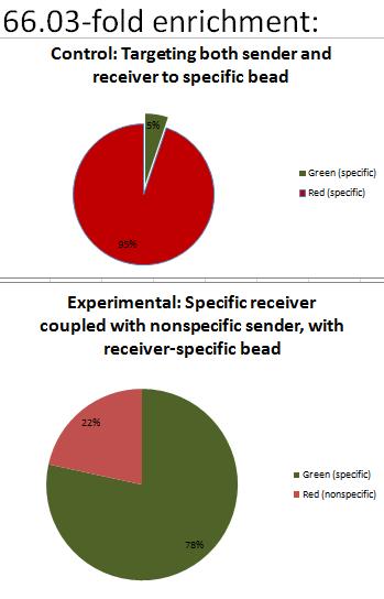Experimental corresponds to strep-tagged receiver (induced) with his-tagged sender (noninduced). Selection for receiver was performed using streptactin beads. Compared to control, 6.8x enrichment.