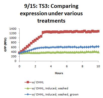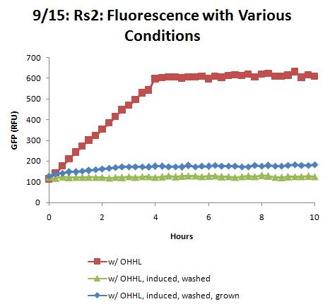 Results show that washed cells display fluorescence growth significantly higher than non-washed cells, but in longer run, noninduced cells still show 2x as much absolute fluorescence. Perhaps more washes / growth before OHHL induction will allow for more fluorescence growth from washed samples. The two graphs below are adjusted for initial GFP values (equilibrated between samples). Graphs are also available with samples starting from the same OD (but not same GFP, apparently; perhaps washing [and almost definitely induction] negatively affects this). These will be posted soon.