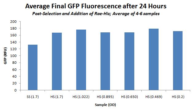 Nickel Plate Results (all averages of 4-6 wells each). Assay involved measuring ODs on both the photospectrometer and the plate reader, binding in a 37C shaking plate reader over 30 minutes. Afterward, the supernatant was removed from each well, and the well was refilled with LB. These results are shown below.