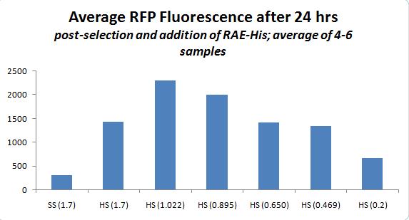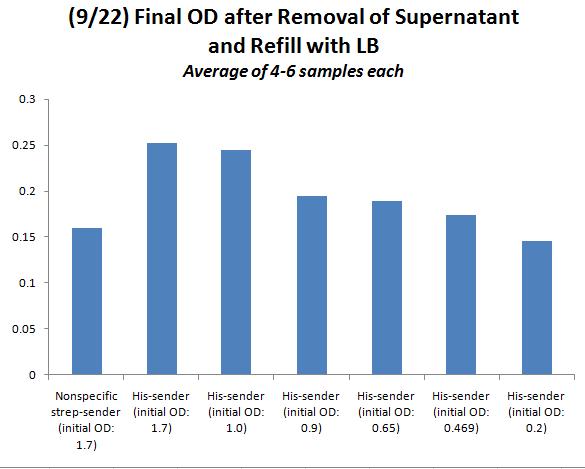 Additional parts of assay included washing with imidazole 3x (10 min shaking, per wash). The clear plate was again refilled with LB. The final OD after washes was extremely low for all samples, with no distinction between specific and nonspecific binding; I suspect that the washing was too vigorous (or the imidazole, at 50mM, too high in concentration), and all specifically bound cells were washed away as well, leaving only small residues. This is a step that may be improved, should I attempt to repeat this experiment for greater enrichment. I also wonder if it is worth repeating this experiment, allowing for binding in a longer time frame (perhaps 1 hr instead of 30 minutes), which may also increase enrichment.