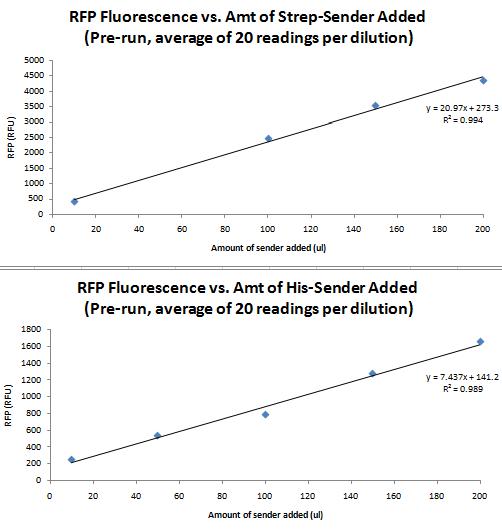 The following shows "dilutions" of senders (actually, added in various amounts of other non-RFP cells). It fits a linear eq pretty well: