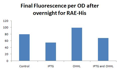 The image below shows that the washed wells showed no drastic increases in fluorescence, as the synthetic-OHHL-treated nonwashed wells did. This indicates that I may be washing away so many receiver cells that no fluorescence is detected, or I am not waiting long enough to detect substantial fluorescence increases (... I would have to start with a larger OD in my kinetic run, since the plates are almost all drying out already by the end of the 24 hr assay). In my re-do assay, perhaps I should not wash with imidazole at all, or allow the cells to bind for longer (though these already bound for 1.5 hr) before washes.