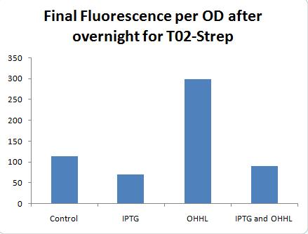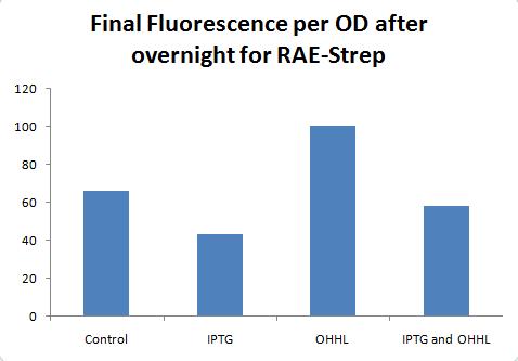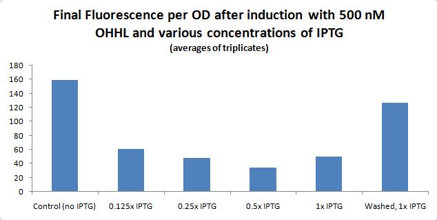 Induced w/ different concentrations of IPTG, incubate at 37C. Will split into two aliquots each: one to be washed pre-addition of OHHL, others left w/ all IPTG and then OHHL addition. Plate reader to be run overnight.