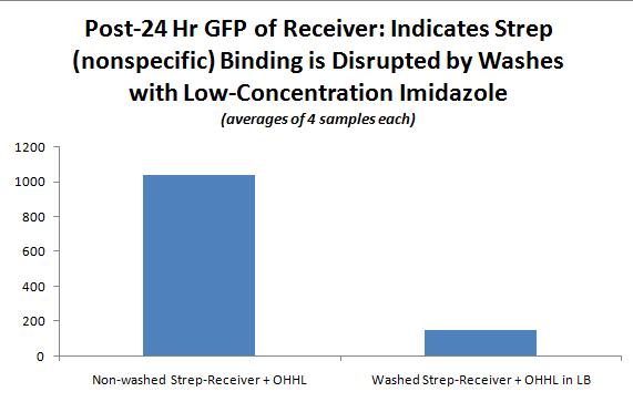 I had washed w/ PBS (no imidazole) because I was afraid the imidazole was preventing all binding. This turned out to be a bad idea because I got a lot of nonspecific binding; that is to say, the strep binding was similar to the his. I did show that, with the amount of his-senders that were left in the well, I was able to activate the GFP expression for the receivers: