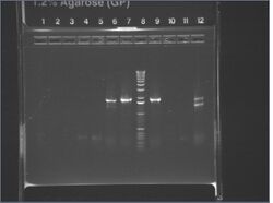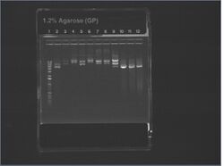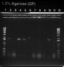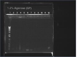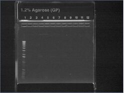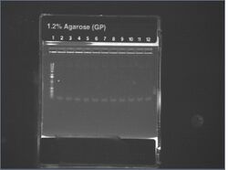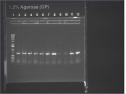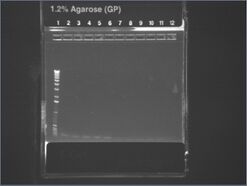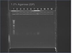 Except for ladder (which had 10uL into 10uL of water), all wells had 5uL of nondiluted miniprep + 15uL water.