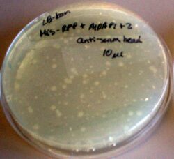 - RFP + AIDAP1+2 (antiserum, 10uL): considerably fewer colonies than normal beads. 66x4 (all apparently white?)